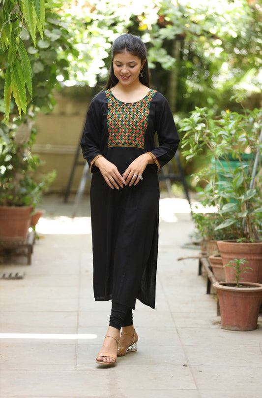 Black Embroidered Rayon Kurta